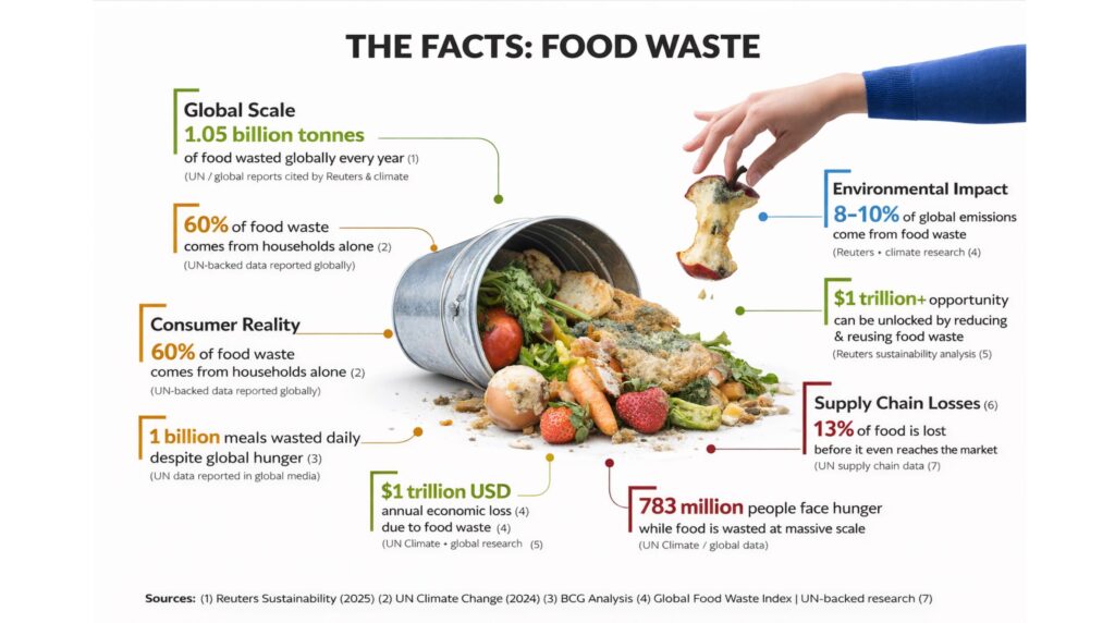 - 8% – 10% of the Global Emissions is caused by food waste, far exceeding the amount caused by aviation and maritime transportation sectors.